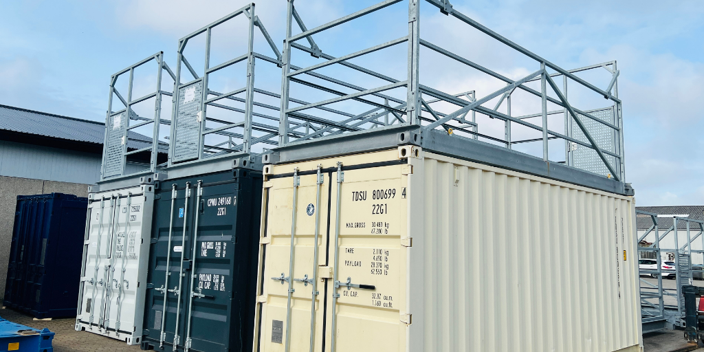 A galvanised frame with guardrails, gate and anti-slip surface – fits directly on top of your container.
