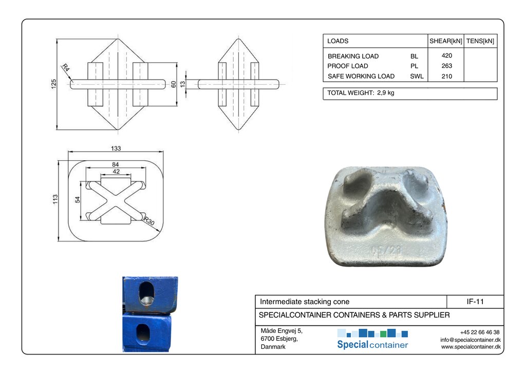 Intermediate stacking cone brukes til å styre en container som er plassert på toppen av hjørneblokker eller hjørner på en lastebil. Det er i prinsippet nøyaktig samme funksjon som en standard mellomtwistlock har. Forskjellen er imidlertid at den mellomliggende stablekjeglen ikke låser seg verken til hjørneblokken den sitter i eller i hjørneblokken som sitter på beholderen som er plassert ned over den. Dens eneste formål er å lede beholderen til å stå riktig, og ikke å holde den der. Fordelen er at den er veldig enkel å ta på og av.